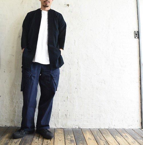 素材はヘンプで、カラーは、通常のインディゴよりも黒い天然染料で染めたブラックインディゴです。