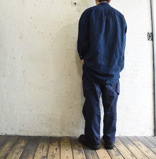 ヴィンテージリネンならではの質感を天然インディゴで後染めした事で非常に良い雰囲気に仕上がりました。