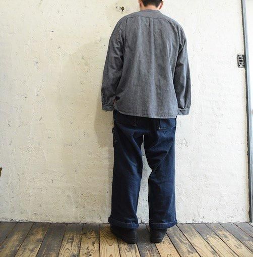 襟の形はノーカラーです。カラーはネイビーのストライプで非常にマリンらしい印象です。