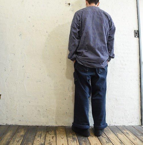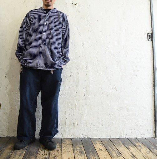 襟の形はノーカラーです。カラーはネイビーのストライプで非常にマリンらしい印象です。