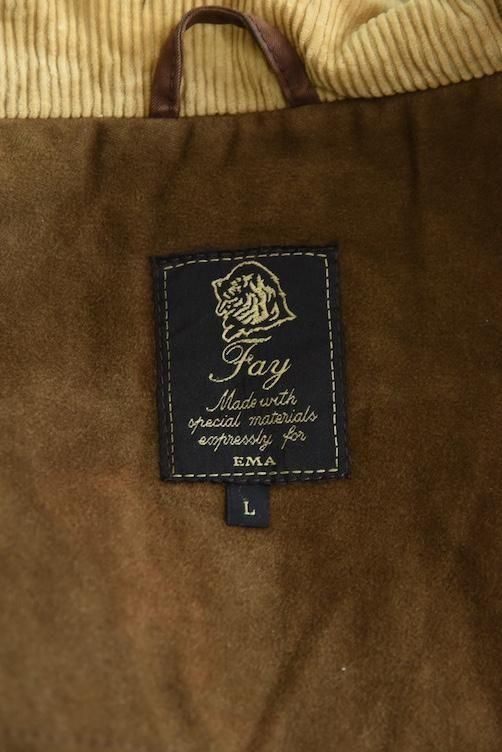 襟はコーデュロイのレギュラーカラー仕様で、首元に程よいアクセントをプラス。フロントトップにはブランドを象徴する消防服由来の留め具「ガンチョ」があしらわれ、ディテールからもFayのルーツを感じ取れます。