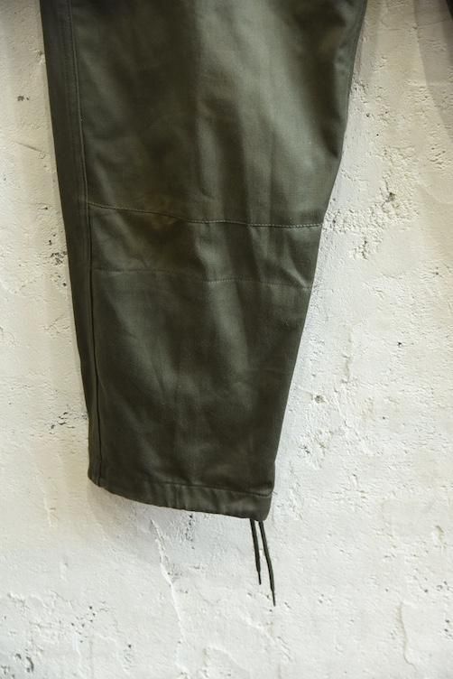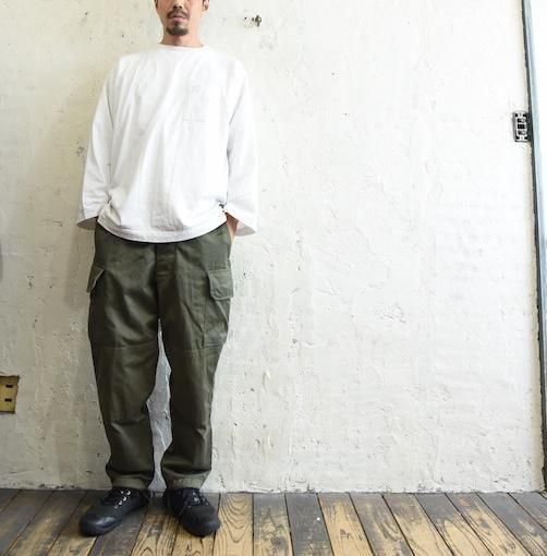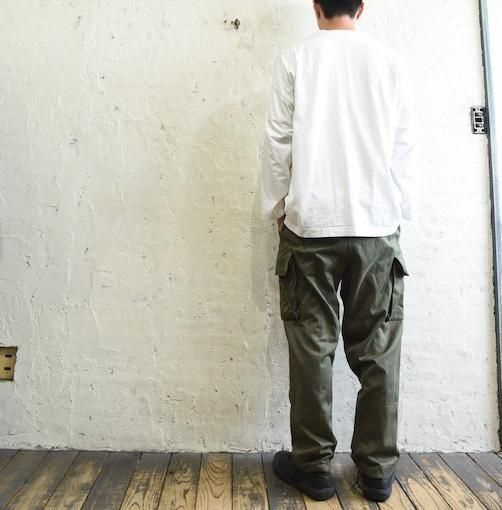 深めの股上とワイドな腰回りから、膝下にかけて自然にテーパードしていくラインは、ミリタリーパンツでありながら現代的なシルエットを描き、武骨さと上品さを併せ持つ絶妙なバランスを実現しています。