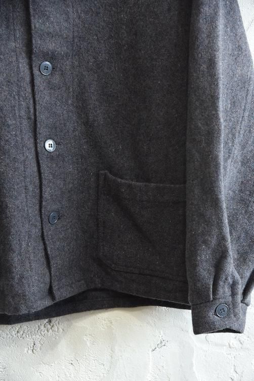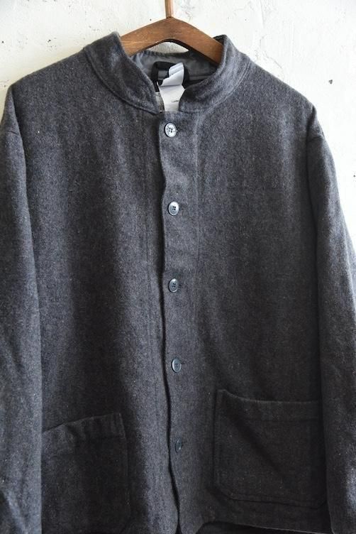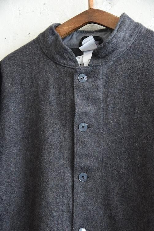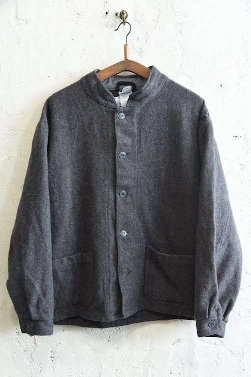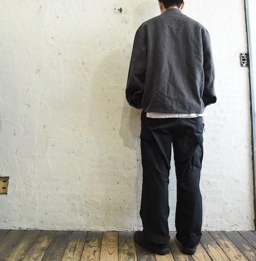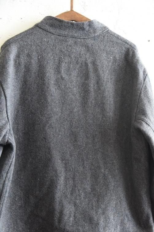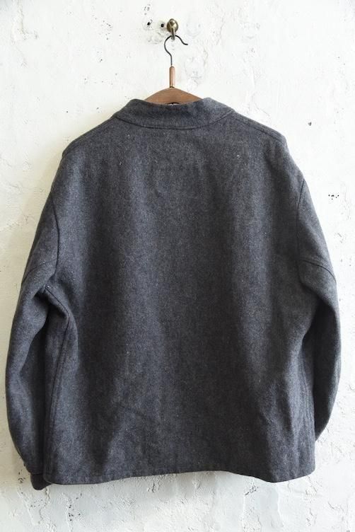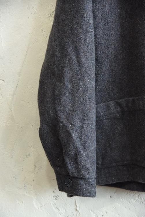 素材には、ネップ感のある表情豊かな厚手のウールを使用。見た目にも温かみがあり、空気を含んだようなふんわりとした風合いが特徴です。グレーの落ち着いたトーンは汎用性が高く、さまざまなスタイルに溶け込みやすい万能カラー。寒い季節に重宝する防寒性に加え、ミニマルで武骨な佇まいが、現代のファッションにも映える一着です。
