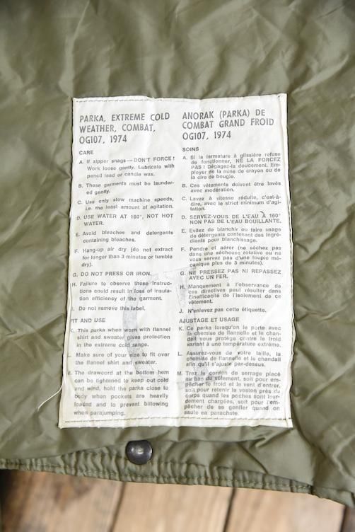 タグには「PARKA, EXTREME COLD WEATHER」「OG-107」「JUNE 1986」の文字。